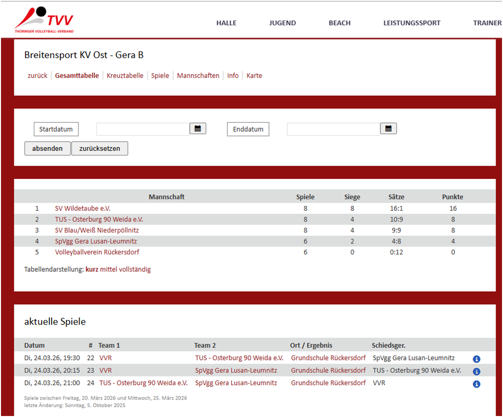 Die Osterburgstädter konnten am vergangenen Spieltag in Rückersdorf (24.3.2026) gleich zweimal punkten. Sowohl das Spiel gegen die Gastgeber als auch gegen Gera Lusan-Leumnitz gewannen die Weidaer mit 2 : 0 Sätzen. Besonders hervorzuheben ist, dass sich beide jüngeren Spieler gut in das Team einfügten und so Spielerfahrung sammeln konnten. Am letzten Spieltag der Saison (24.4.2026) stehen die Teams aus Rückersdorf und Niederpöllnitz als Gegner auf der anderen Seite des Netzes.